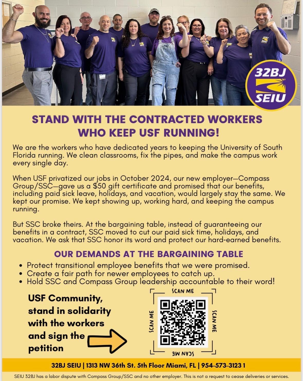 As previously reported, the blue-collar bargaining unit at USF was a toll of 2023's union-busting SB 256. After the state decertified the union, USF privatized the jobs, contracting the work out to Compass Group/SSC. After about of year working non-union, workers successfully unionized with 32BJ SEIU, the largest property service workers union in the country with over 185,000 members.